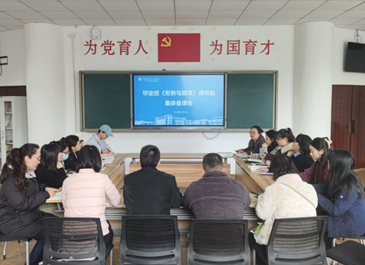 为深入学习贯彻习近平新时代中国特色社会主义思想,全面贯彻落实党的二十大和二十届四中全会精神,扎实推进党的创新理论“三进”工作,及时回应学生思想关切、解读时事热点,引导青年学生准确把握国内外发展大势,3月5日,我校毕业年级《形势与政策》课程组在三教A213会议室召开春季学期集体备课会。会议由年级备课组长李林婷主持,全体课程教师参会。